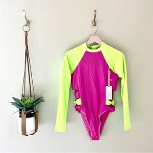A collaboration with the surf and swimwear experts at Hurley, this LoveShackFancy one piece brings a fresh look to a sporty rash guard with neon colorblocking and cool cutouts.