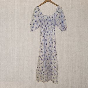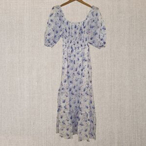 White maxi dress with blue floral pattern lends a soft and dreamy look. Puff sleeves and ruffle detailing on skirt add to the whimsical design. Smocked waistline creates extra shaping for a lovely silhouette
