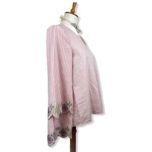 Pink and white v neck blouse with layered, embroidered wide sleeves.