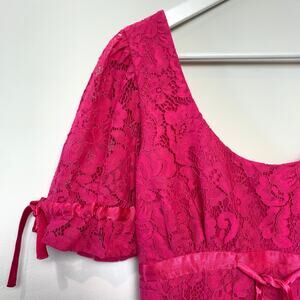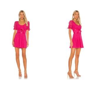New with Tags Lovers + Friends Cloud Nine Pink Lace Scoop Back Puff Sleeve Mini Dress. Lace overlay in barbie pink. Scoop neckline and low back. Zipper in the back. Lined dress. Tie adjustment in the front and on the sleeves. A line and empire waist. Lovers and friends hot pink dress.