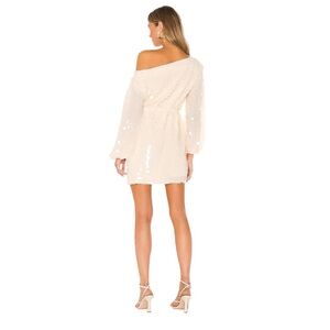 The NWT Lovers & Friends Micah Shell Beige Round Sequence Mini Dress in size L is a stylish and elegant cocktail dress with a unique off-the-shoulder design and 3/4 bell sleeves. Made from polyester with sequin accents, this short dress features a pullover closure and is perfect for parties or special occasions. It comes in a flattering size L and includes a belted waist for a sophisticated look. Hand wash only to maintain its quality, this dress is a chic addition to any woman's wardrobe.