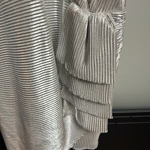 Poly blend Hand wash cold Fully lined Pleated metallic fabric Hidden back zipper and button closure