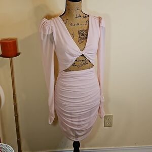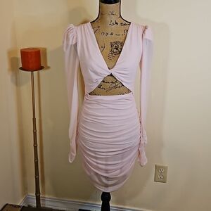 NWT Lovers + Friends pink ruched cut out dress, long semi sheer sleeves, invisible back zipper, fully lined, size Small. Barbiecore. Excellent new condition, measurements in pics, smoke free home, ships next day. Bundle and Save!