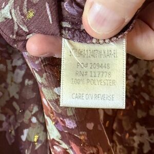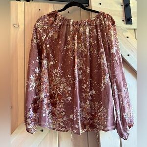 Chic mauve peasant blouse with floral pattern and gold threading . Lightweight and flowy. Tie neck- boho perfection.