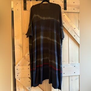 Stylish open-front kimono cardigan with side slits. Features black and blue tie-dye pattern with a touch of red. Soft and comfortable fabric. Sweater fabrication. Lightweight and gorgeous!