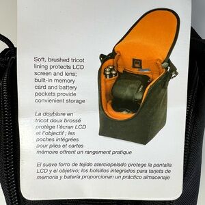 Soft, brushed tricot lining protects LCD screen and lens; built-in memory card and battery pockets provide convienient storage.