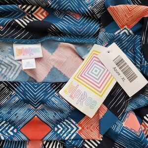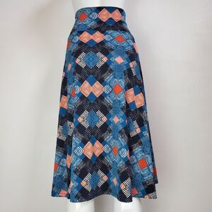 NWT LuLaRoe Azure blue, orange, and white geometric knee-length skirt with wide elastic waistband.