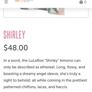 Brand new with tags! LuLaRoe โShirleyโ kimono in size Large. A lightweight, open-front layering piece with a relaxed fit and elegant drape. Perfect for casual outfits, vacation looks, or festival-ready styling. Features flowy sleeves, side slits, and soft sheer fabric that moves beautifully.
