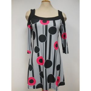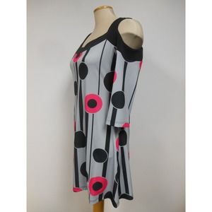 Fun and whimsical, this wrinkle-free Luc Fontaine grey, pink and black cold shoulder tunic has 3/4 sleeves. The black trim at the arm holes and neck gives this top a special look. Worn with leggings or capris and you are ready for summer. Size 12 measures 22" armpit to armpit.
