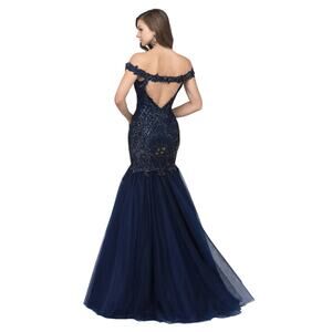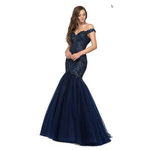 NWT Lucci Lu 28062, Off the Shoulder Navy Trumpet Tulle Gown Beaded, 10