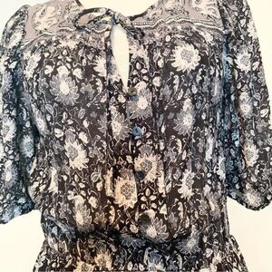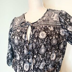 Lucky Brand Boho Printed Peasant Dress, button closures at chest with neck tie, elastic at waist and sleeve, bottom portion is lined