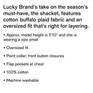 New with tags Lucky Brand Shirt Jacket. Blue/White Buffalo Plaid oversized Shacket. Full button up. Pockets. Great layering piece. MSRP $ 99