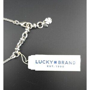 This new with tags Lucky Brand elegant necklace features turquoise stone accents and intricate floral designs on a silver-tone chain. It offers adjustable sizing for versatility and a secure clasp for ease of wear, making it a sophisticated accessory for polished styling.
