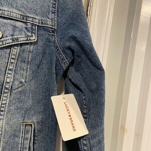 Lucky Brand New with tags Womens size small Medium Wash cotton denim Jean jacket Long sleeve collar chest pockets side slash pockets Button up Stretch