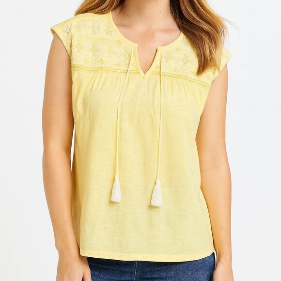 Brighten up your wardrobe with this charming yellow cap sleeve top from Lucky Brand. Featuring delicate white and yellow embroidery across the shoulders and a split neckline with tassel ties, this piece adds a touch of boho flair. The lightweight, breathable fabric and relaxed fit make it ideal for warm weather or easy layering.