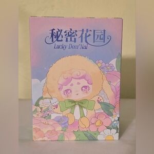 This is a new, multicolor Lucky Deer Nai Secret Garden Series Plush Blind Box. The front features a pastel illustration of a hooded character amidst flowers, with "秘密花园" and "Lucky Deer Nai" text. One side displays eight distinct plush character designs. The back provides product details in both Chinese and English, including materials (82% polyester, 16% ABS, 2% PC shell; 100% polyester fiber filling) and an age recommendation of 15+. Great gift for kids and adults alike.