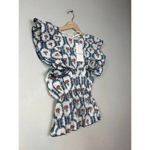 NWT Lug Von Siga Linen Jessica Back Tie Ruffle Sleevless Blue Flower Blouse Top