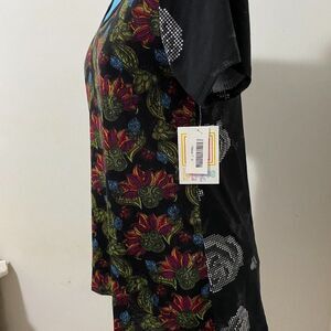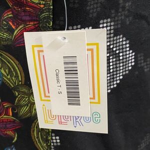 NWT Lula Roe Classic T Womens Top Size Small Top is 96% Polyester 4% Spandex. Beautiful Floral multi color top is Black green blue red orange front with a contrasting back and arms that are black and white.