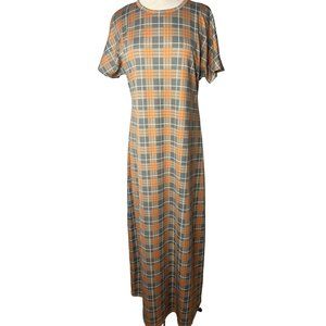 NWT Lula Roe Dress Large Orange Gray White Plaid Maxi Sheath Short Sleeve Round