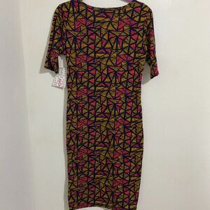 NWT Lula Roe Julia Womens Dress Size Small Dress is 96% Polyester 4% Spandex Multi Color Gold Red and Navy