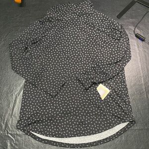 LulaRoe Amber Hoodie - Large. Fits sizes: 14-18. NWT. Smoke Free home. This is a light weight hoodie that is perfect for layering. It has raglan sleeves, a crisscross neckline and slight high-low hemline. It has a lined hood, front pouch pocket and extended cuffs. Color: Black with white flowers.
