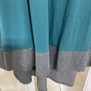 LulaRoe Carly Dress - X-Small. Fits Sizes: 2-4 (could fit up to an 8 - stretchy). NWT. Smoke Free Home. This is a Swing type dress with High Low hem line. It has a front patch pocket on the left side. Color: Green with Gray bottom hemline.
