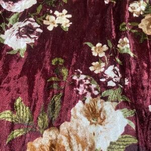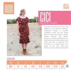 LulaRoe Cici Dress - Large. Fits sizes: 14-16. NWT. Smoke Free Home. This is a flirty style dress. It has an elastic, ruffled neckline. Fitted style bodice and a ruffled hemline. This dress can be dressed up or worn very casual. Great for vacations. Color: Maroon, tan, and pink. The material has like a velvet feel. Made in the USA