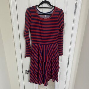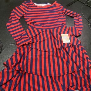 LulaRoe Georgia Dress - Med. Fits sizes: 10-12. NWT. Smoke Free Home. This dress has long sleeves and a flattering scoop neck. It has a flirty and feminine three-tiered skirt. Very comfortable. Colors: Red & Blue.