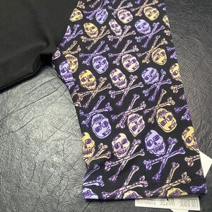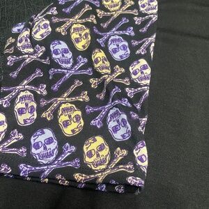 LulaRoe Irma Top - XS. Fits sizes 2-4 but can fit up to a 12. NWT. Smoke Free Home. This is a loose high-low tunic with fitted mid length sleeves. The extra length in the back makes it a great compliment to leggings. Color: Black with purple & light yellow skulls. This would be a fun Halloween shirt. ☠️