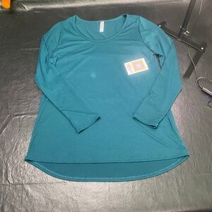 NWT LulaRoe Lynnae Top (L). Fits sizes 14-16. Smoke Free Home. This is a long sleeve, High low hemline, scooped neckline and hourglass tailoring. Very stretchy. Color: Green. Made in USA.