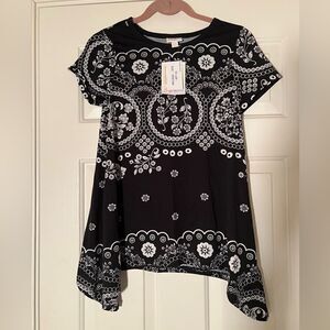 The Details: The Melissa is a tunic top with a sharkbite hemline. She's fitted in the bust and flares to a relaxed fit in the waist.