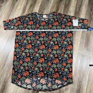 NWT Lularoe Irma Blouse Orange and Green Roses on black background, sz:XL