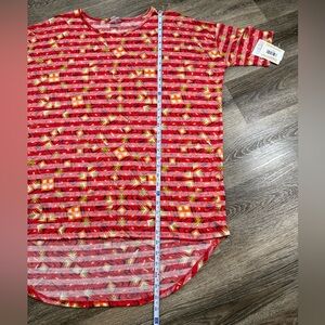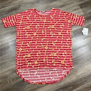 NWT Lularoe Irma Blouse Red/Pink stripes with Geometric Yellow sz: L