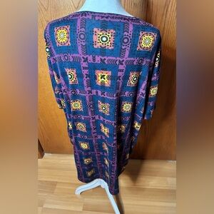 This NWT Lularoe Irma shirt is a stylish and comfortable addition to any wardrobe. The round neck and short sleeves make it a perfect choice for casual wear, while the geometric pattern and high-low tunic style add a touch of uniqueness to the outfit. The shirt is made of a polyester blend material and is machine washable for easy care.