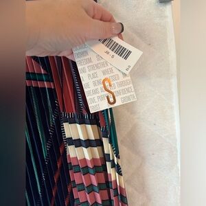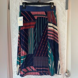 Accordion midi skirt with stretch waistband. Gorgeous colors; blues and pinks with gold accents- great with a tall boot and chunky sweater. 100% polyester. (BIN2)