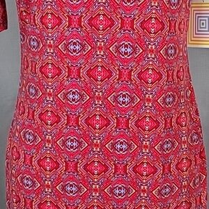 NWT Lularoe Julia is a form fitting, knee-length, knit dress — with mid-length sleeves and a high neckline. Its simple silhouette makes it the perfect canvas for layering and accessorizing. Dress has an overall maroon, blue, and cream geometric pattern. Fabric is 96% polyester and 4% spandex.