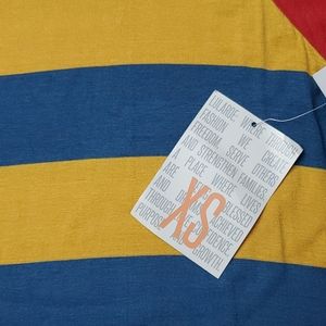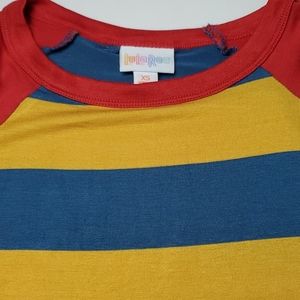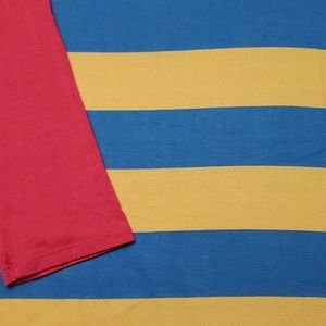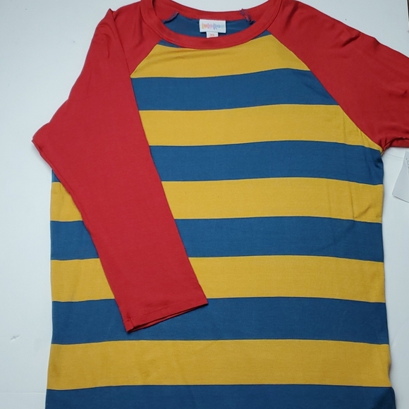 Baseball style tee with 3/4 length Raglan sleeves. Grayish blue and mustard stripes with red sleeves. Stretchy, super soft, and slinky material.