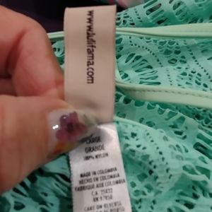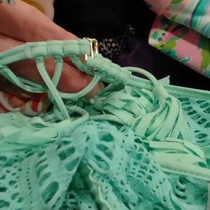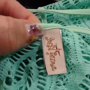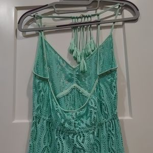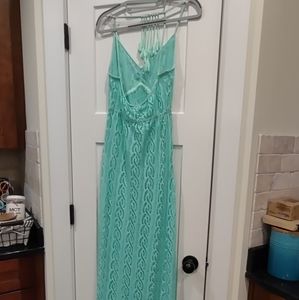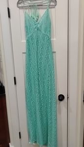 NWT stretchy seafoam color dress. Perfect under a slip or over a bathing suit. Tassel detail on back with clasp neck closure. Elastic scrunch under bustline. Size Large. Maxi.