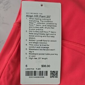 NWT Lululemon Align High-Rise Pant 25" Pale Raspberry Size 6