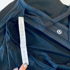 NWT Lululemon CYB black tank. It is slightly gathered at the waist to give you the scrunched look. There is an attached bra with no bra pads.