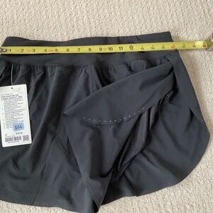 3 inch inseam. These shorts have a liner(like underwear built in). The front and back overlap on each side (last picture). Size 10. Black.