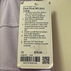NWT Lululemon Lavender Pace Rival Skort Size 10
