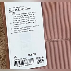 NWT Lululemon Power Pivot Ribbed Cropped Tank Top Dusty Pink Sz 10 Athliesure