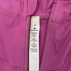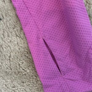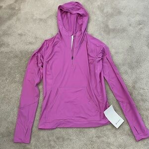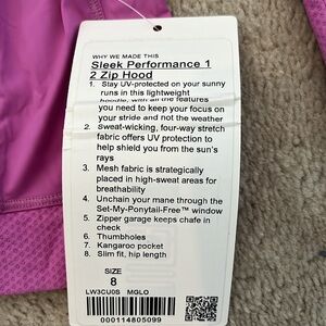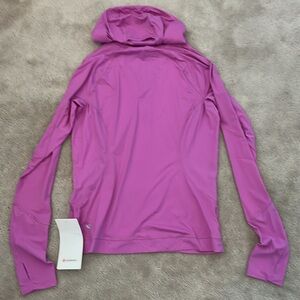 Stay UV protected in this lightweight hoodie. Sweat-wicking, four way stretch. Set-my-ponytail free window in hood. Thumb holes, kangaroo pocket, slim fit, hip length.
