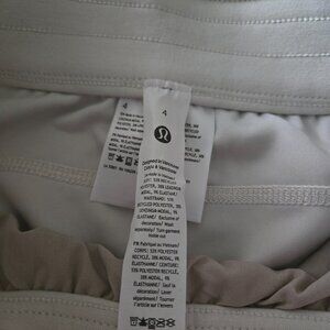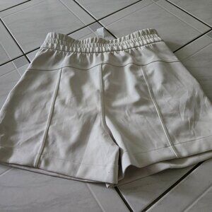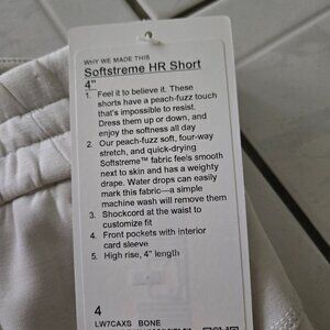 Lululemon Softstreme High Rise Shorts. These are in the bone color and a size 4. They are brand new with tags and measure as follows: waist-28 inches, hips-33 inches, rise-11 inches, and inseam-4 inches.