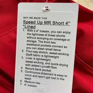 Lovely NWT❤️Lululemon Speed Shorts Dark Red Medium Rise and 4” rise — these are sold out online. So price marked accordingly due to rarity.