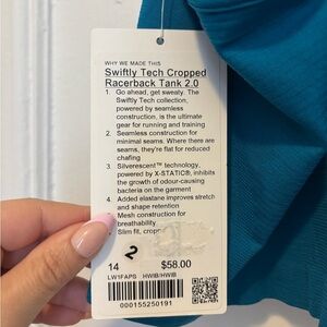 NWT Lululemon Swiftly Tech Cropped Racerback Tank Top 2.0 Hawaiian Blue 14