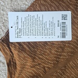 NWT Lululemon Swiftly Tech RB tank 2.0 in water surface copper/bold beige. Size 14. This is a beautiful copper color! No flaws! Unfortunately it's too big for me and needs a new home.