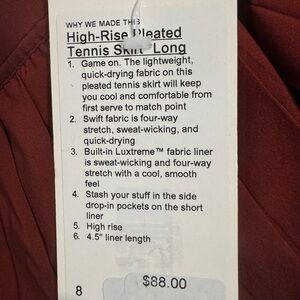 NWT Lululemon Wine/Red Varsity High-Rise Pleated Tennis Skirt Long Size 8
