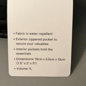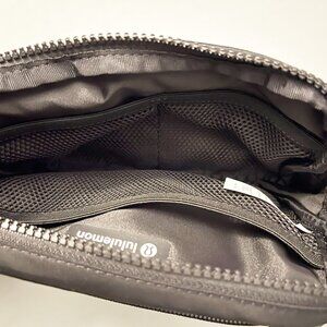 New with tags Lululemon everywhere belt bag. It is water-repellent. Has an outer zippered pocket and 3 mesh pockets inside. Size is 7.5" x 2" x 5". In great condition. Comes from a pet/smoke free home.